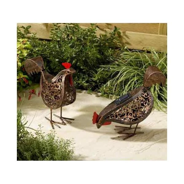 Als je graag een originele, kwalitatieve decoratie wil toevoegen aan jouw tuin, dan is dit paar metalen sierkippen de ideale keuze. De haan en de hen zijn voorzien van verlichting op zonne-energie zodat zo ook ’s avonds en ’s nachts jouw tuin leven inblazen. Elke kip is voorzien van een bolle spiegel die het licht optimaal verspreidt waardoor deze kippen veel meer licht laten uitschijnen.